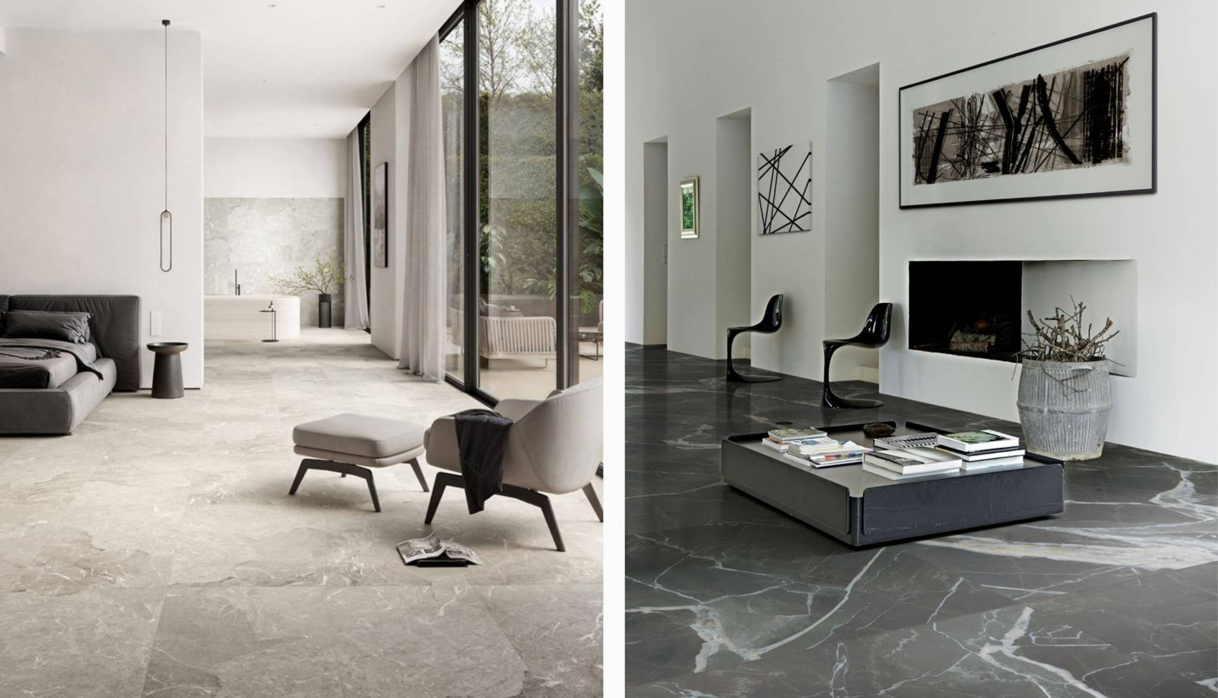 Large-format marble tiles are increasingly used for creating seamless surfaces, on floors, wall tiles, and table tops. Fewer grout lines make spaces appear cleaner, more expansive, and luxurious.